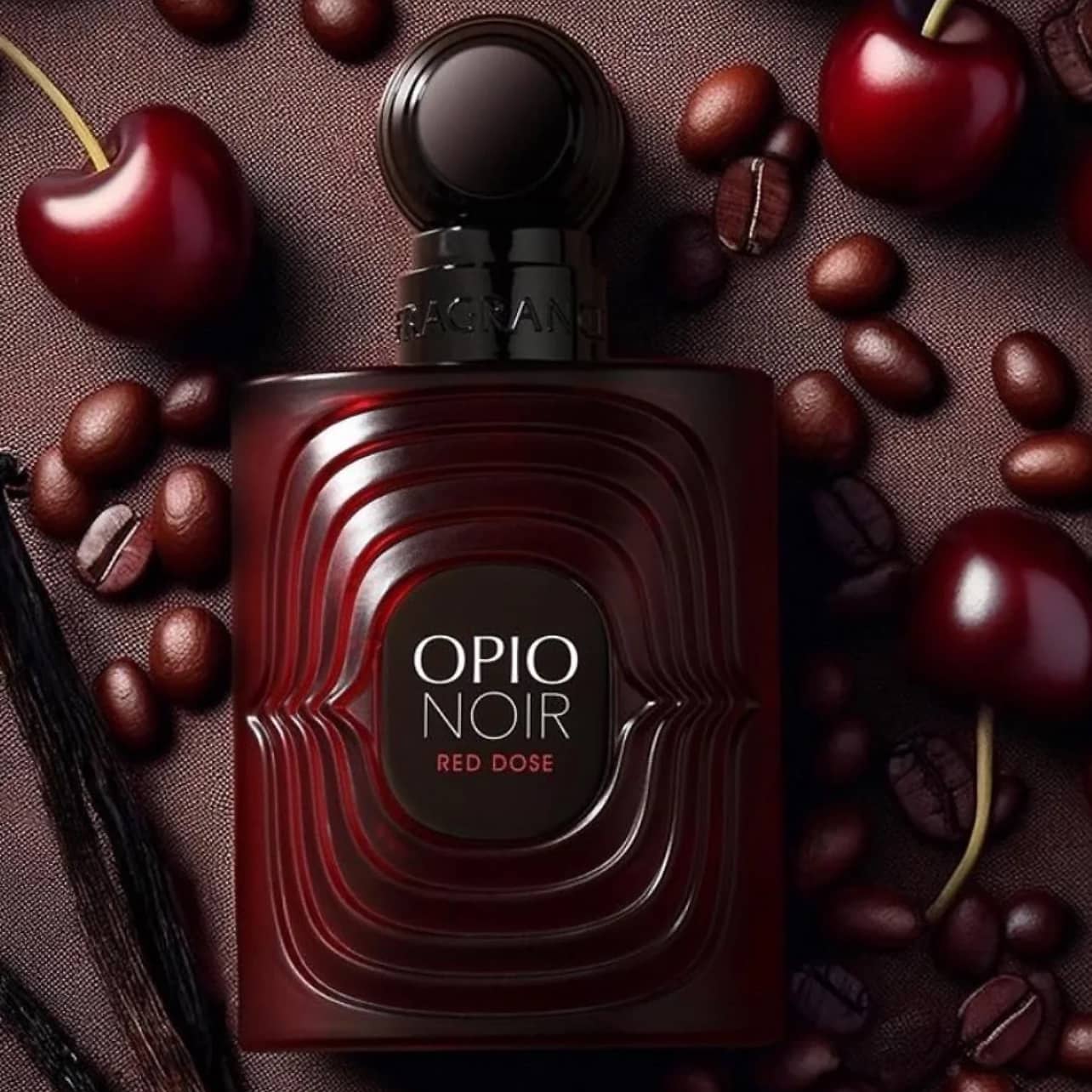 ادکلن فراگرنس ورد مدل اوپیو نویر: عطری که با رایحه هوس‌انگیز گیلاس و قهوه، شما را به دنیایی از شور و جسارت می‌برد.